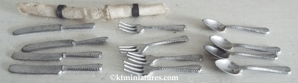 Marion Osborne shows a boxed set of cutlery and napery in her 'Return to Tiny Toy' article in Doll's House World, Issue 156, September 2005. The contents had been added to, but those which she identified as likely to be original were a few pieces of cutlery and three napkins. Of these she said: "The napkins in their rings are far more likely to be original as the rings are made from a strong wire that is wound around the napkin four-and-a-half times. The napkins are 1 3/4in long and the cutlery nearly 1 1'4in long".